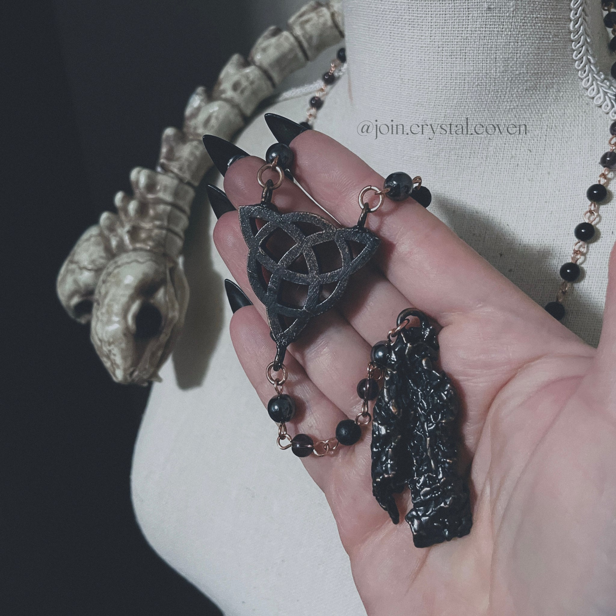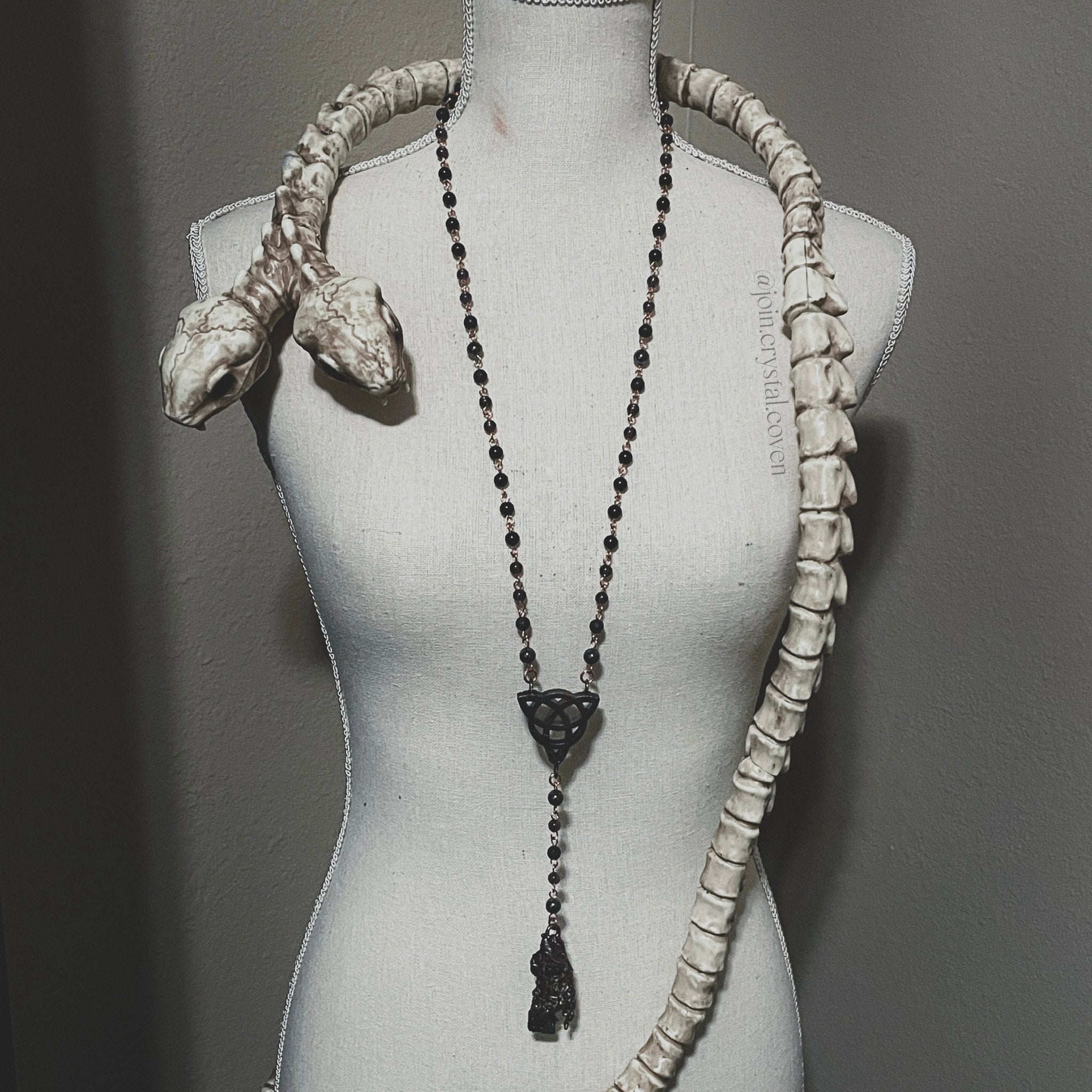 The Triquetra Void Witch’s Rosary Talisman channels a unique and purposeful energy. Obsidian is a stone of divination, frequently used in scrying mirrors to access altered states and divination. A Triquetra in reverse is believed to channel void energy. If you’ve are called to upset the status quo, challenge your own perspective, or dive into shadow work, this talisman may be a good companion for your work.