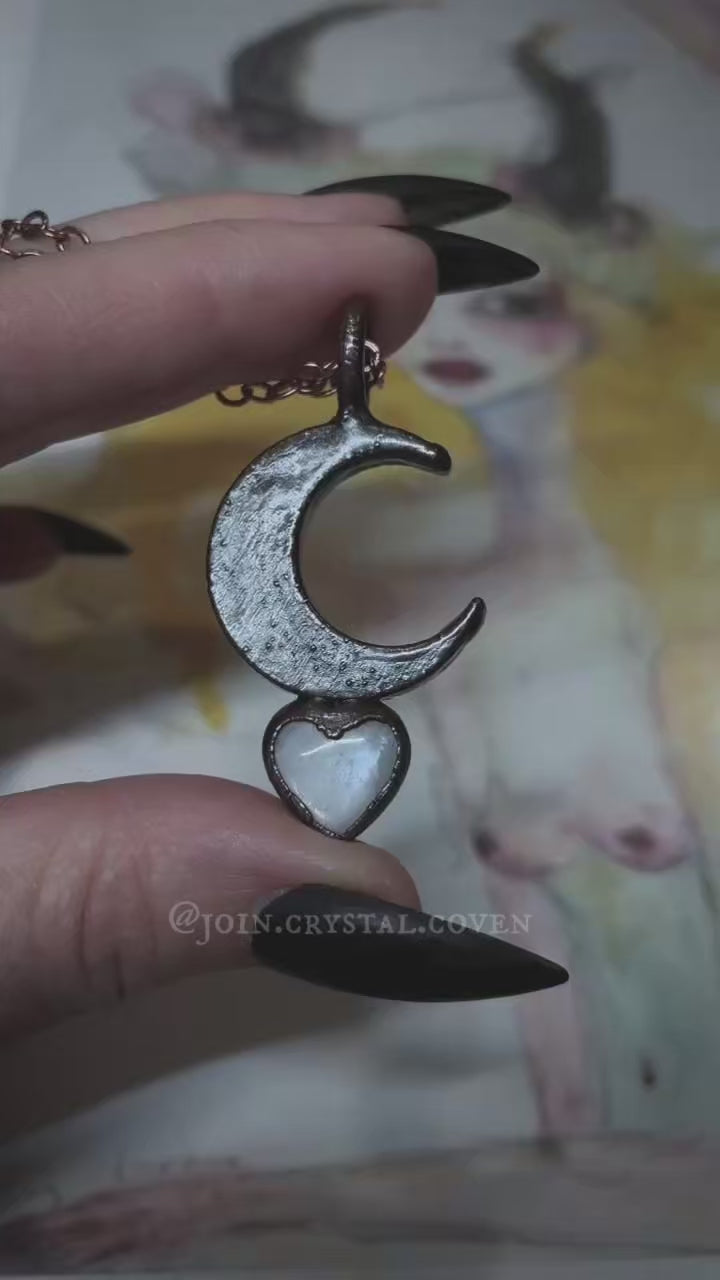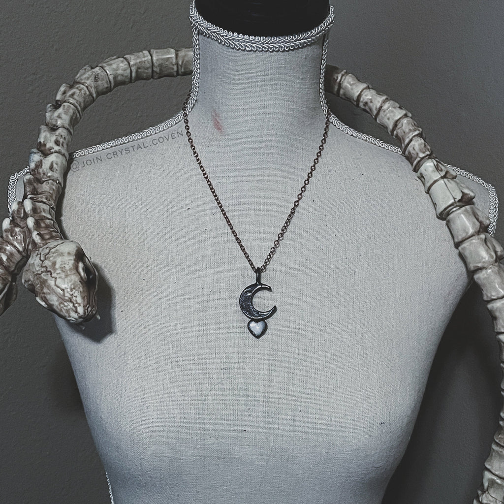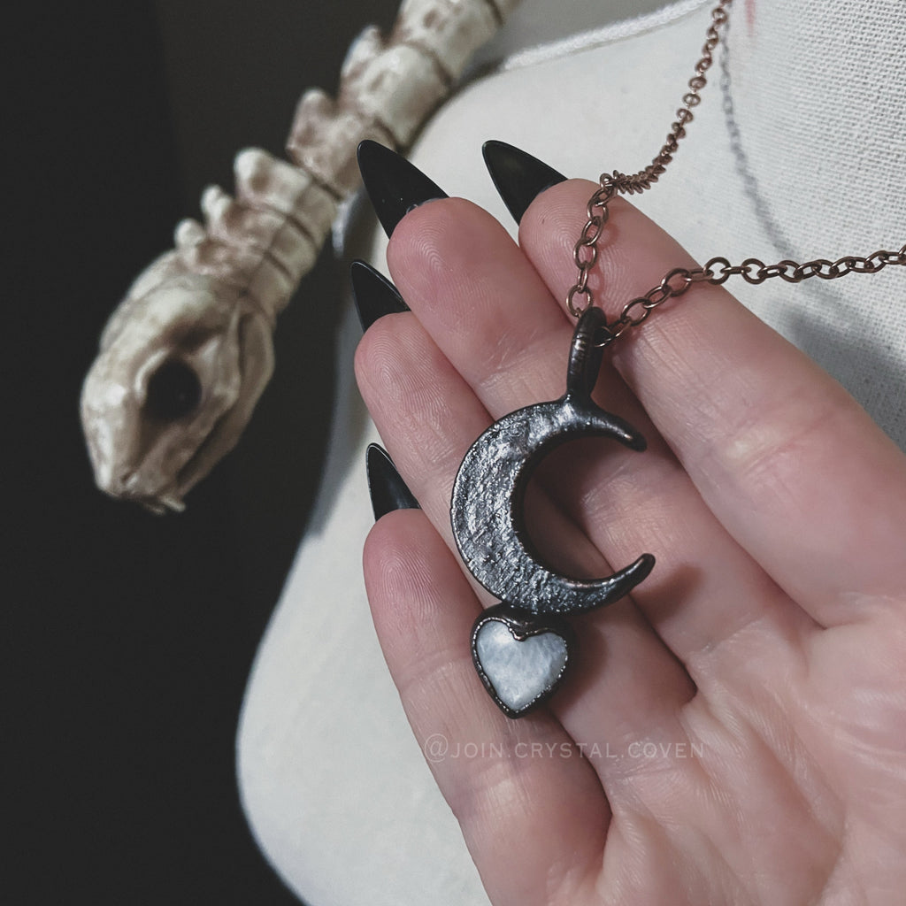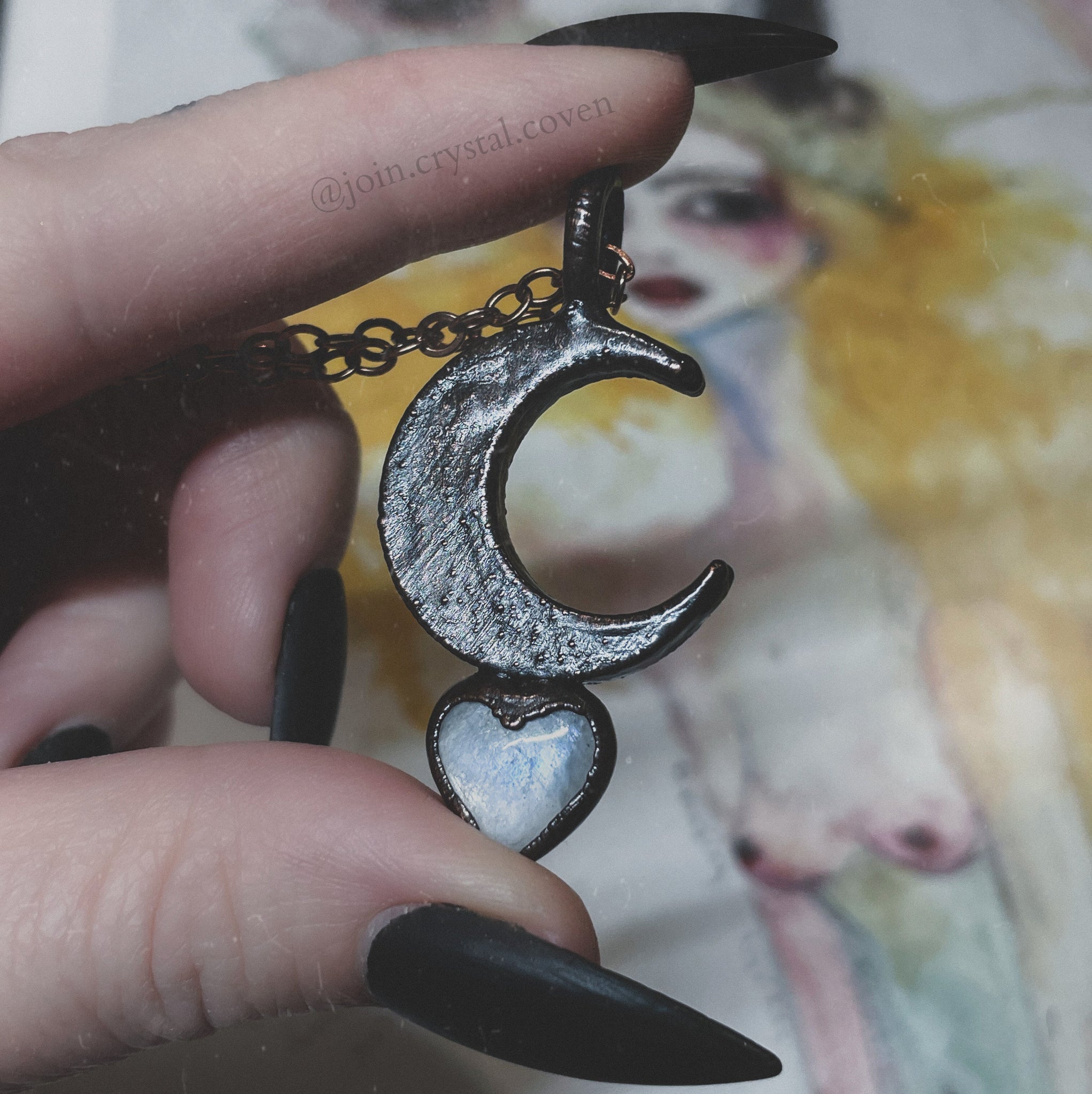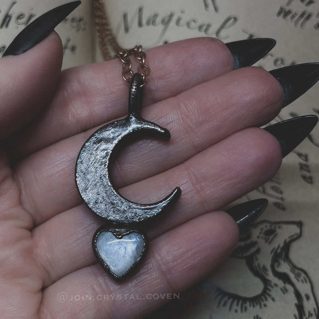 The Moonstone Heart of the Witch Talisman features a Rainbow Moonstone heart and a wood crescent core.