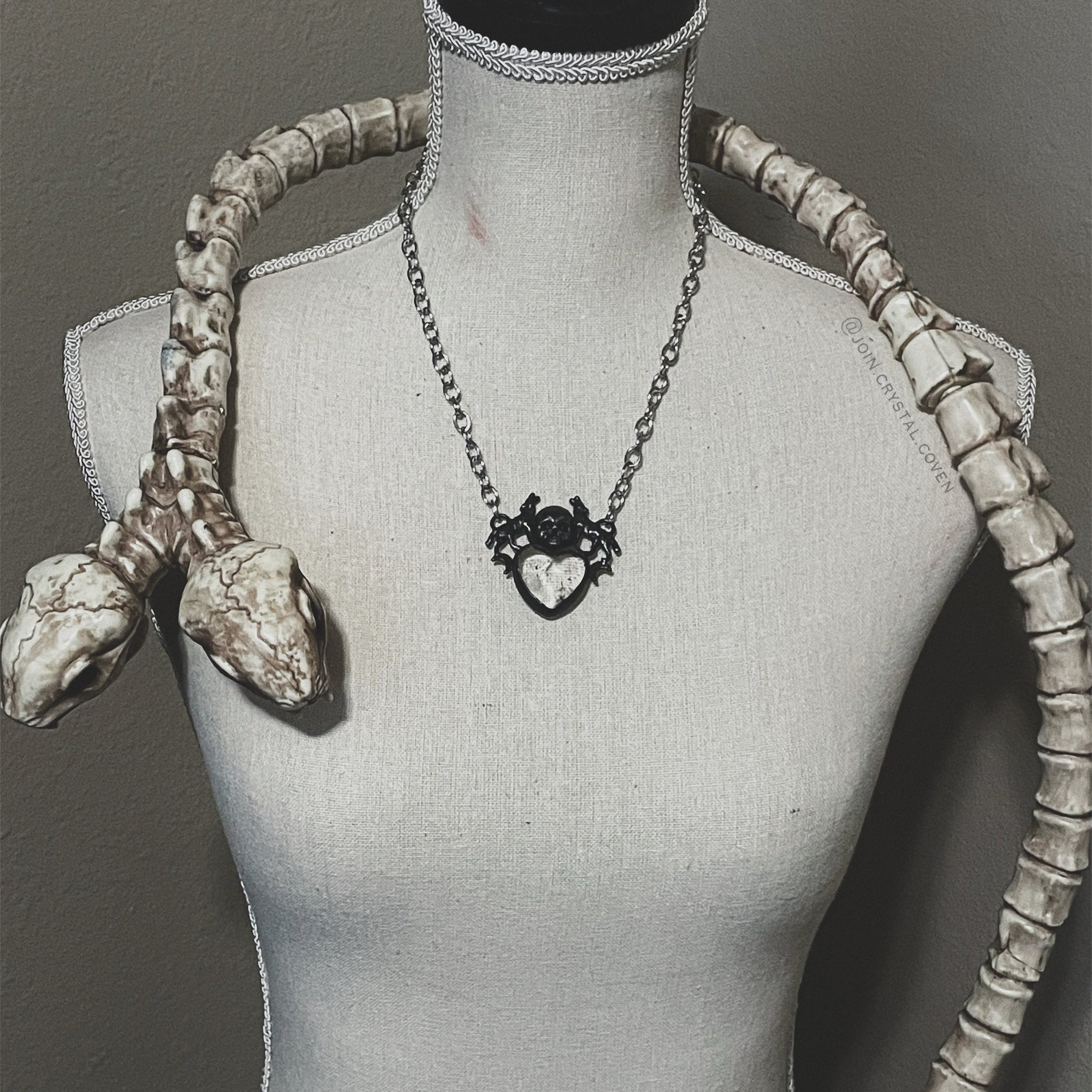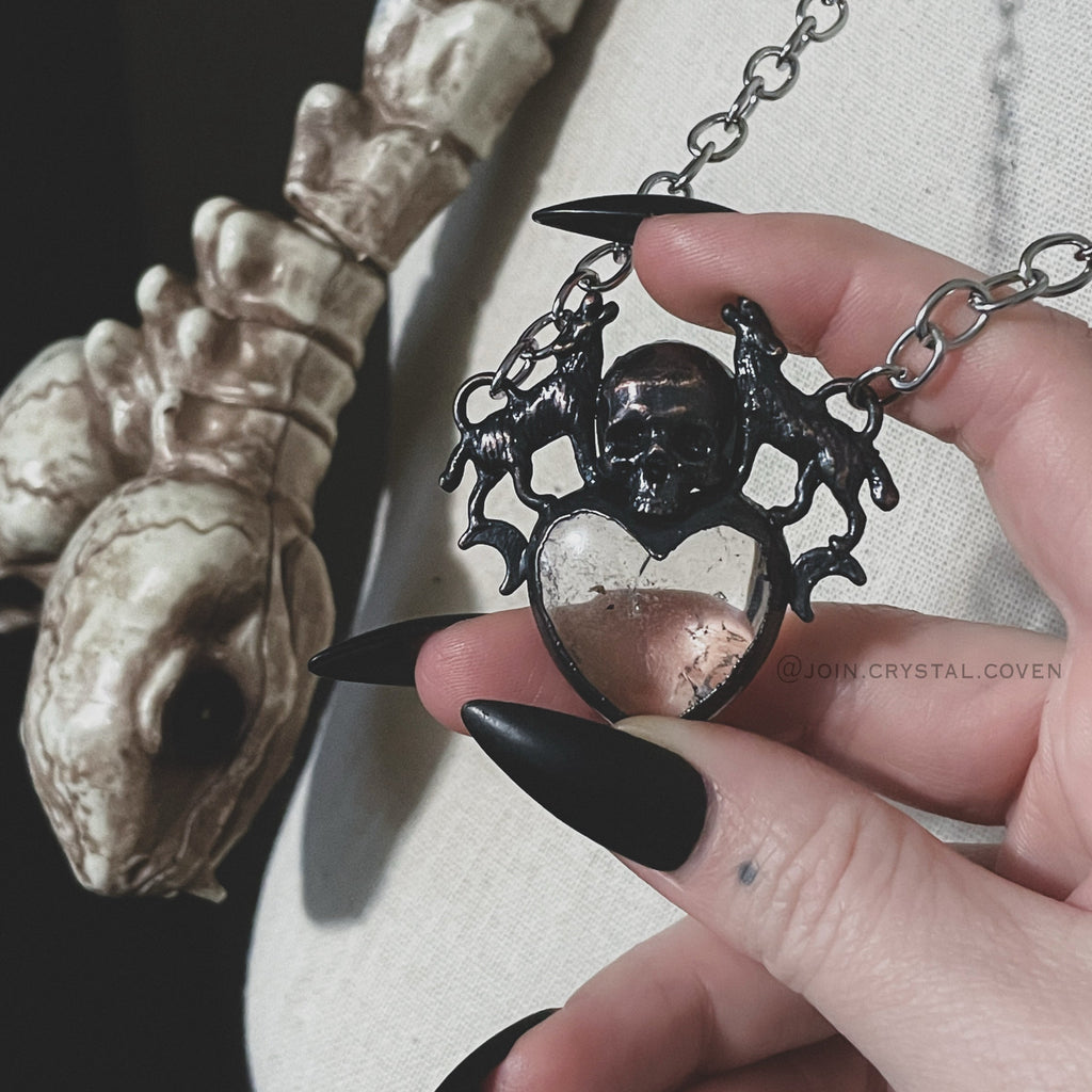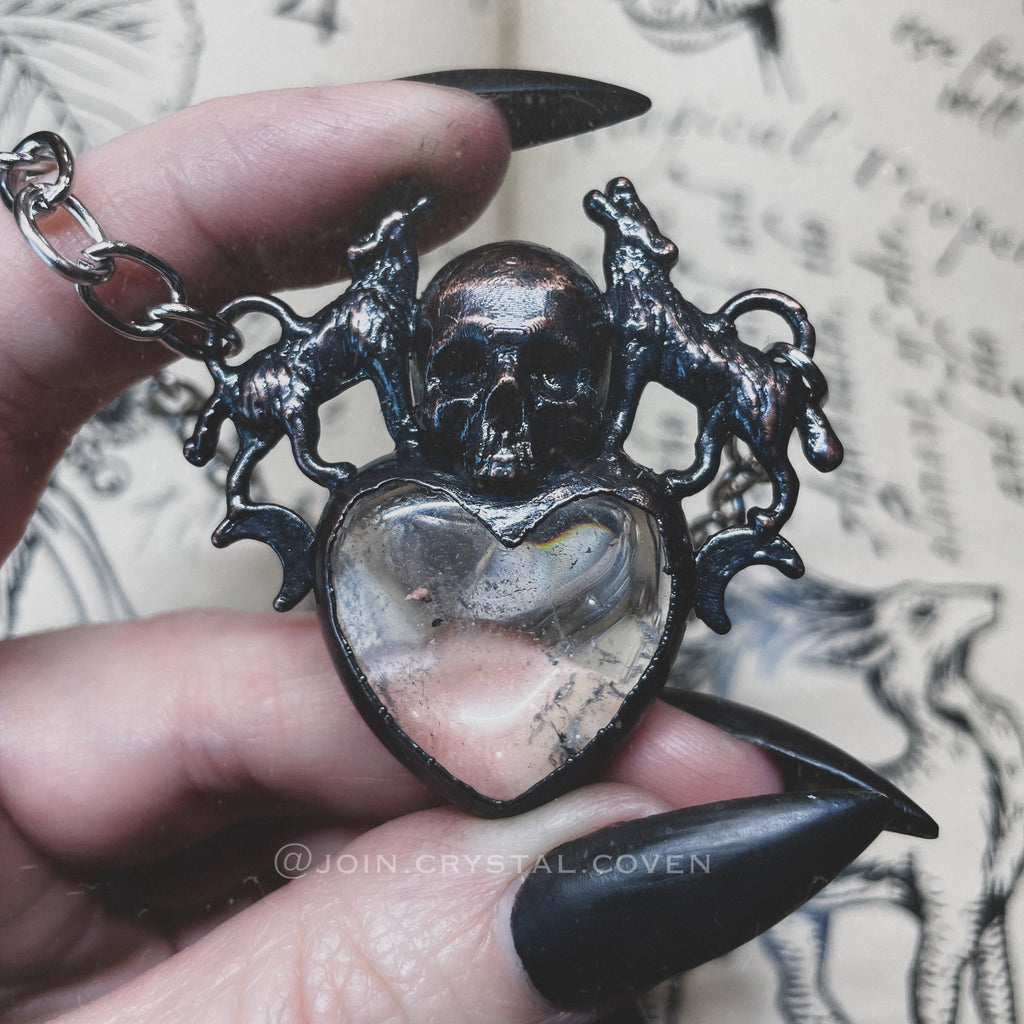 The Wolf Guardian Heart of the Witch Talisman features a Clear Quartz heart topped with a partial skull, two wolves and two tiny crescent moons.