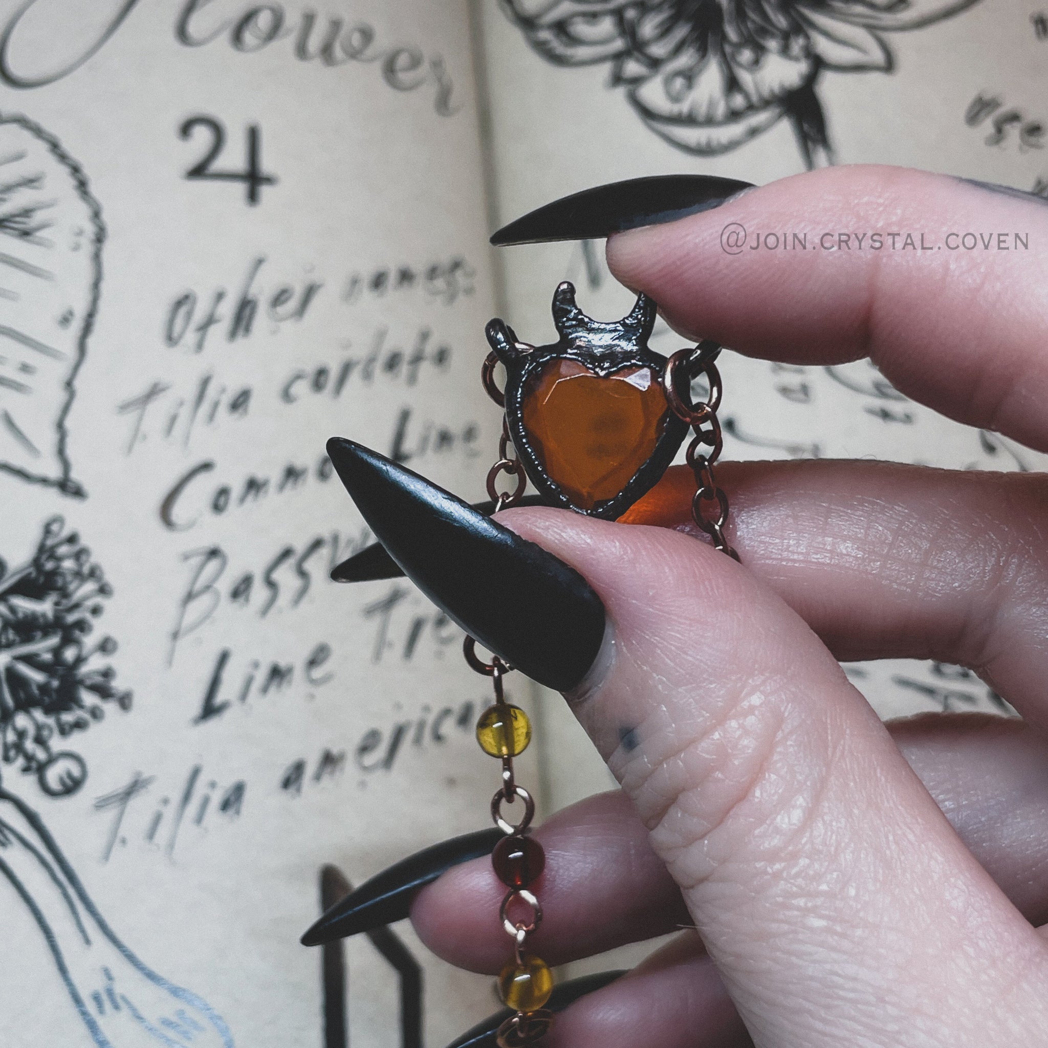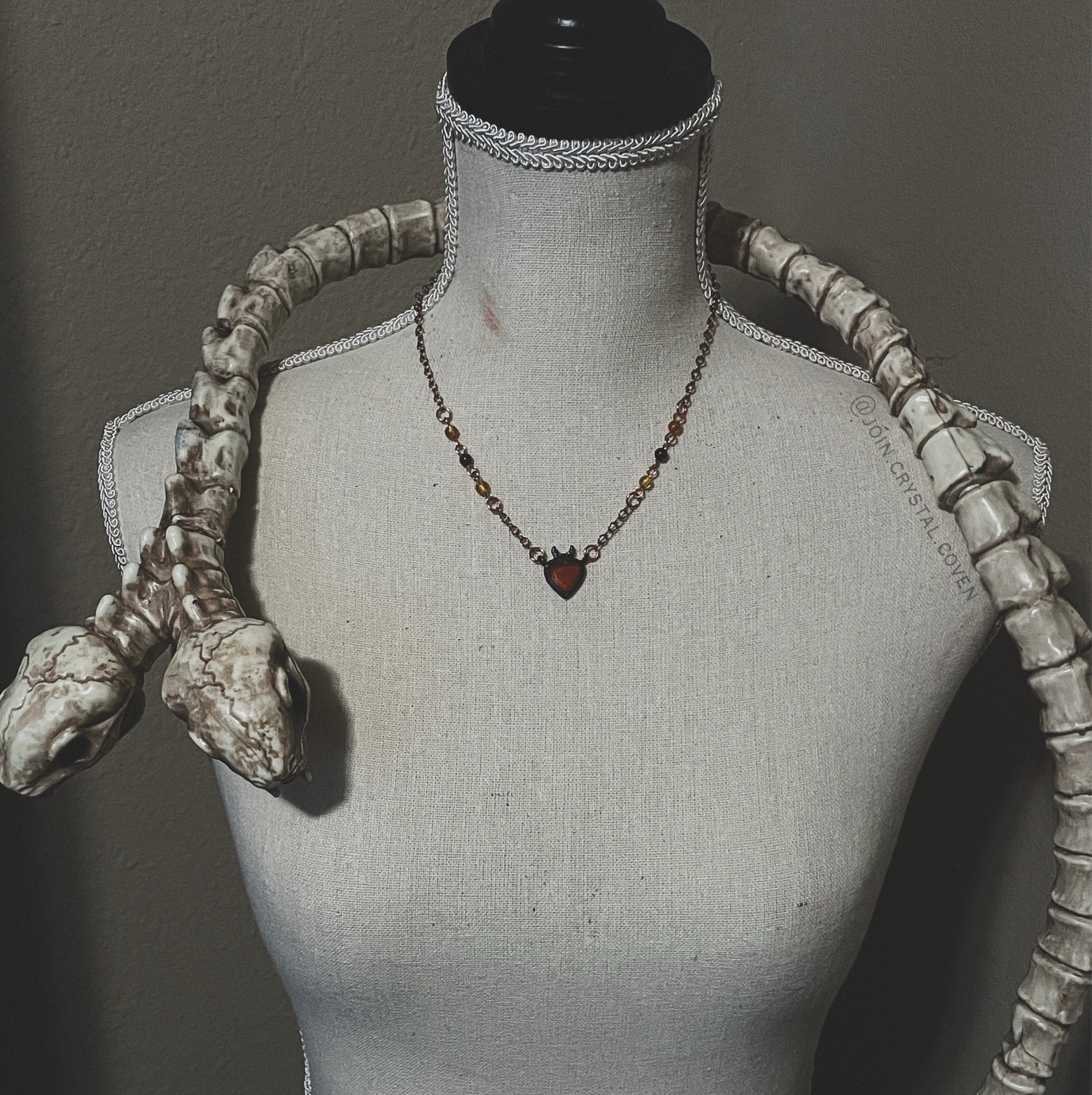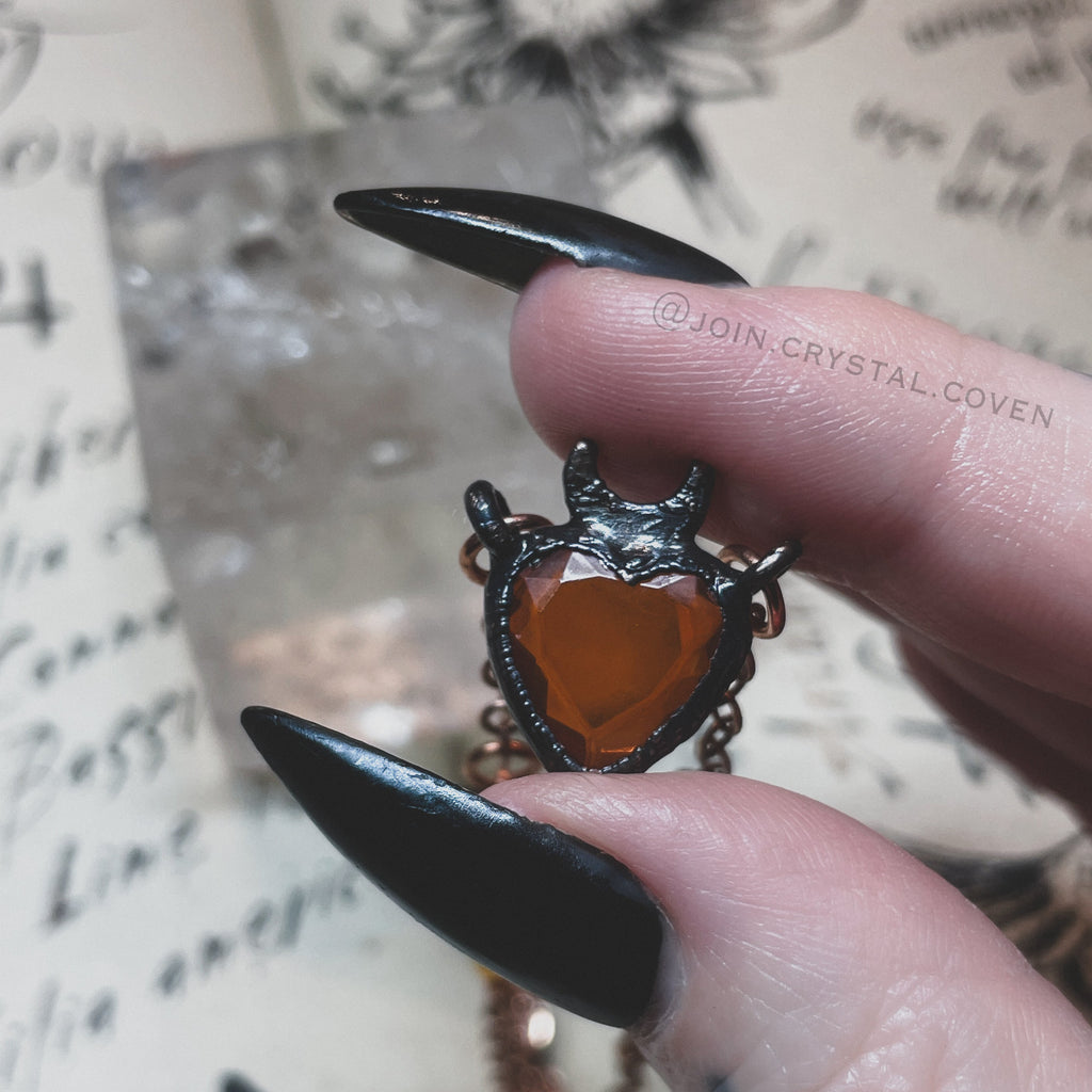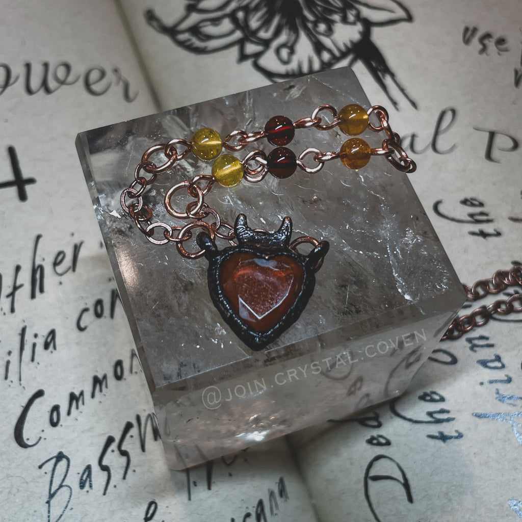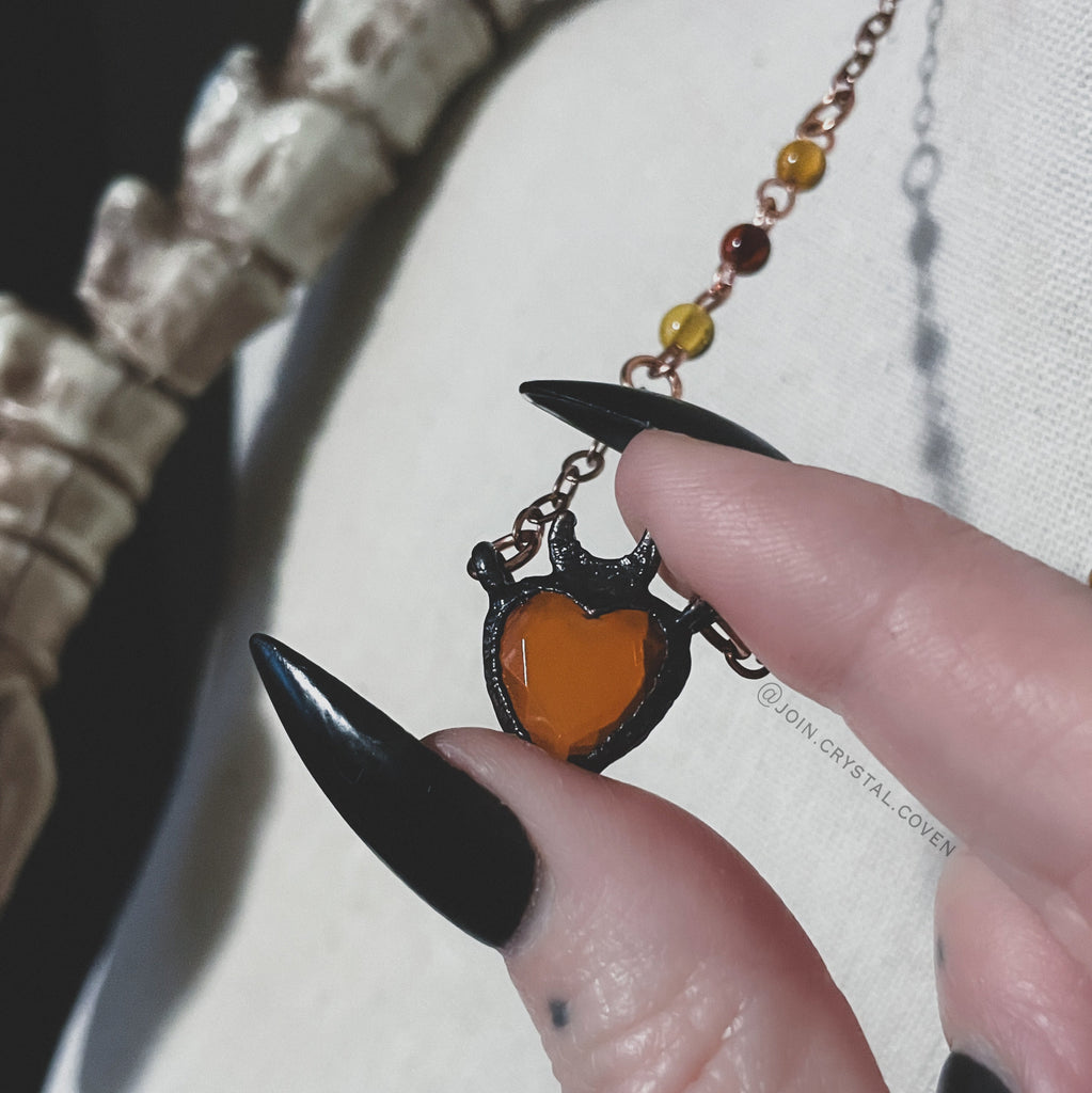 The Amber Heart Talisman features a gorgeous faceted Baltic Amber heart set in blackened copper and a partially hand beaded raw copper chain with Amber beads. The raw copper will oxidize and darken as you work with your talisman.