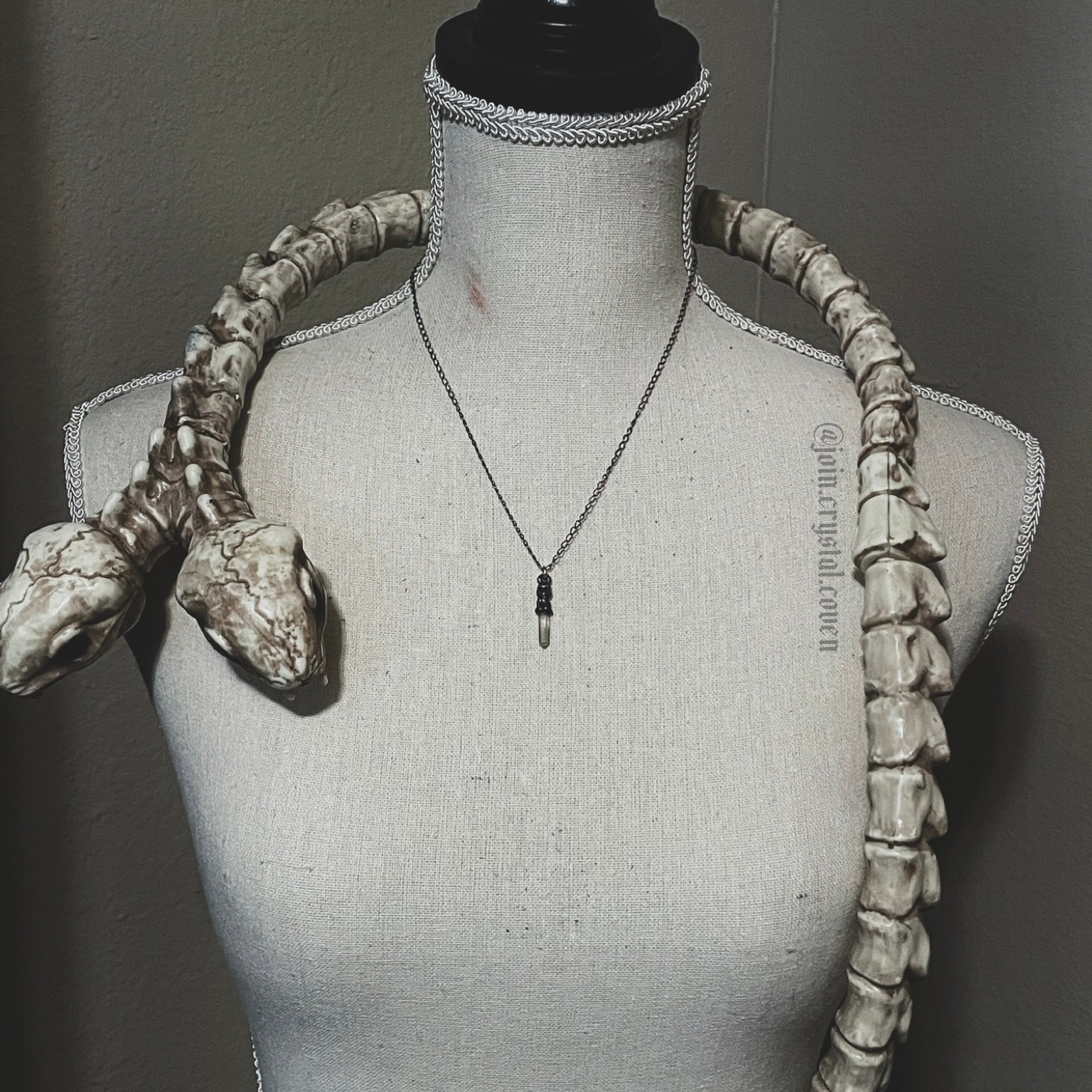 The Ancestor Talisman is composed of a Clear Quartz crystal point and tiny skull encased in a thick amount of blackened copper.