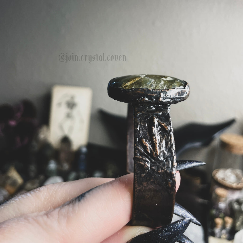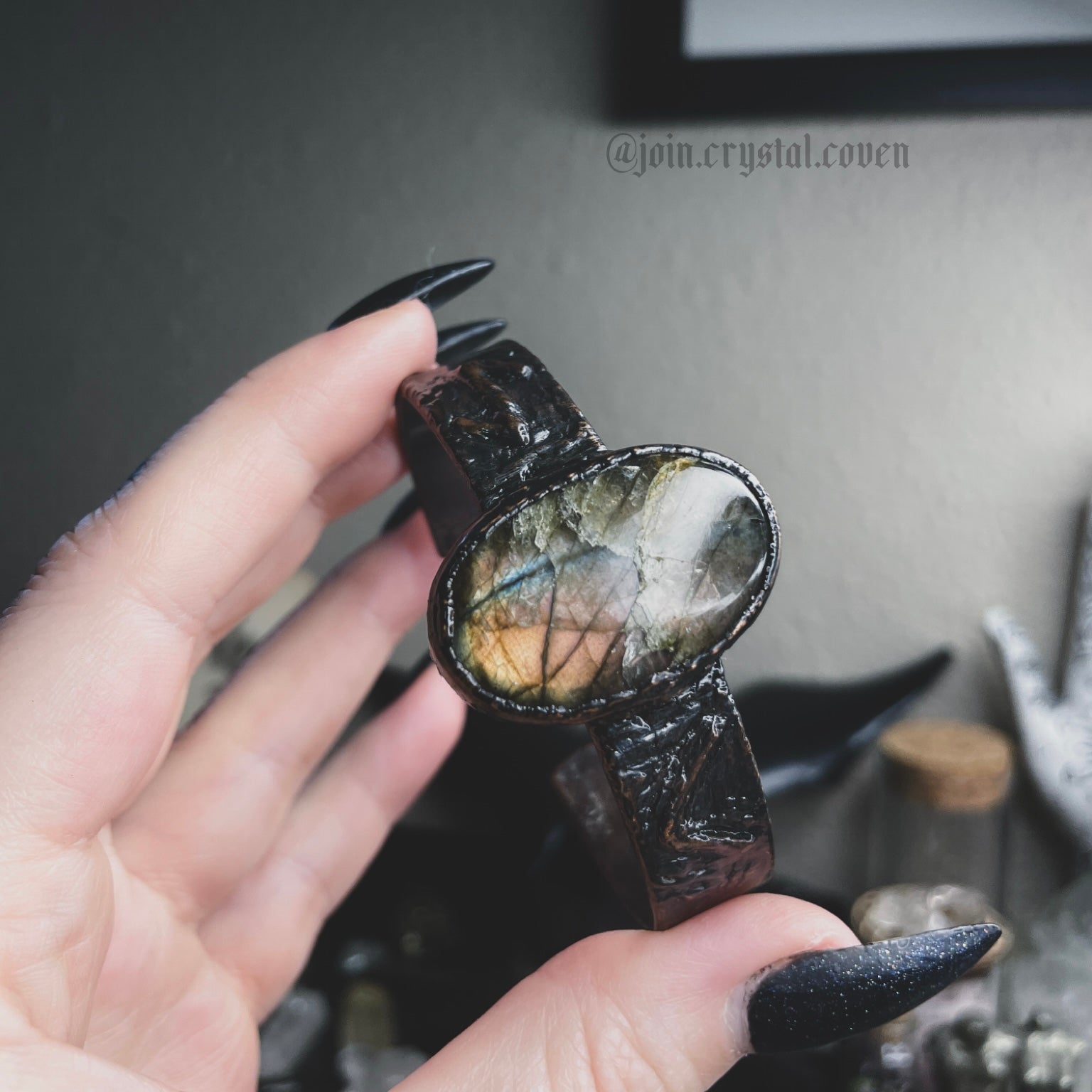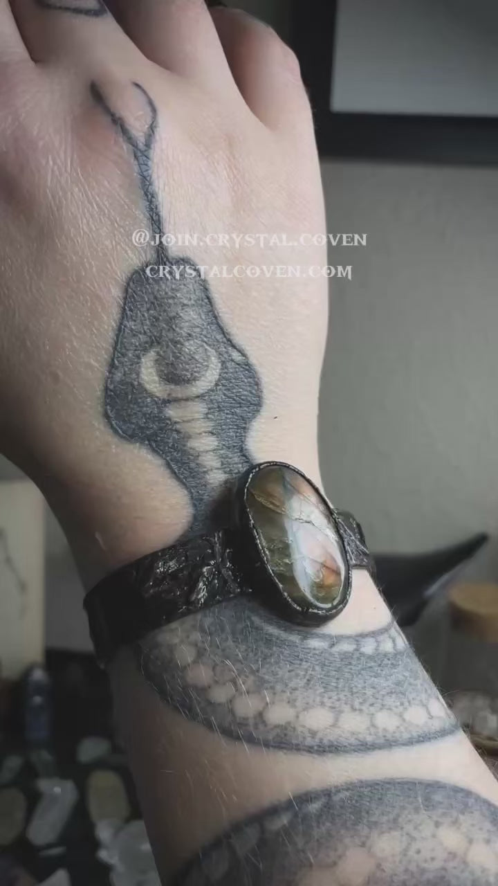 The Labradorite Rune Cuff features the Elder Futhark runes ihwaz and kenaz.