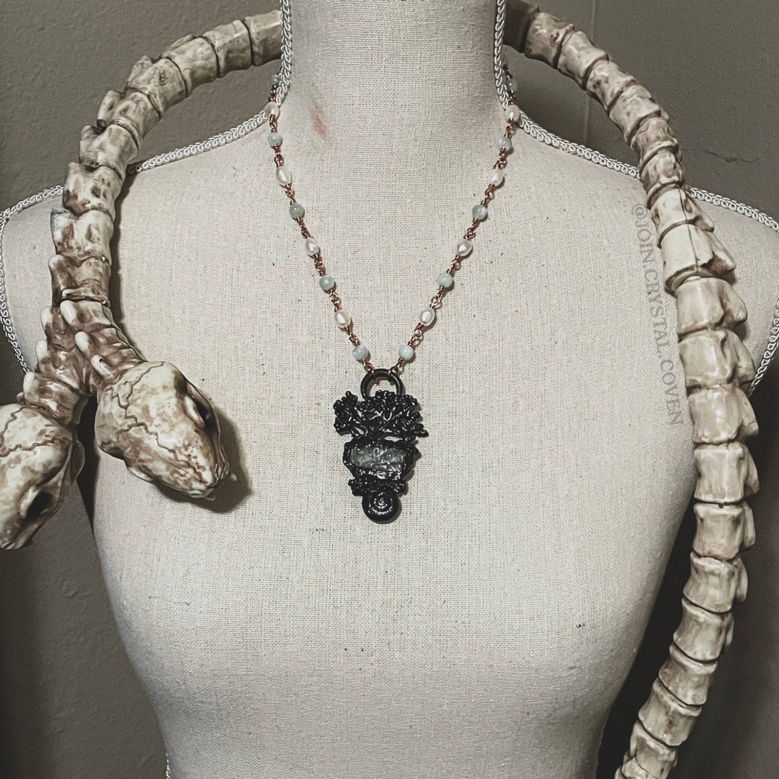 The Ancient Waters Talisman features an incredible rainbow filled raw Aquamarine, a small shell (that I gathered locally), lichen fashioned like sea life, and a small stick carefully encased in a thick amount of blackened copper. The chain is handmade using raw copper, Green Moonstone and fresh water pearls.