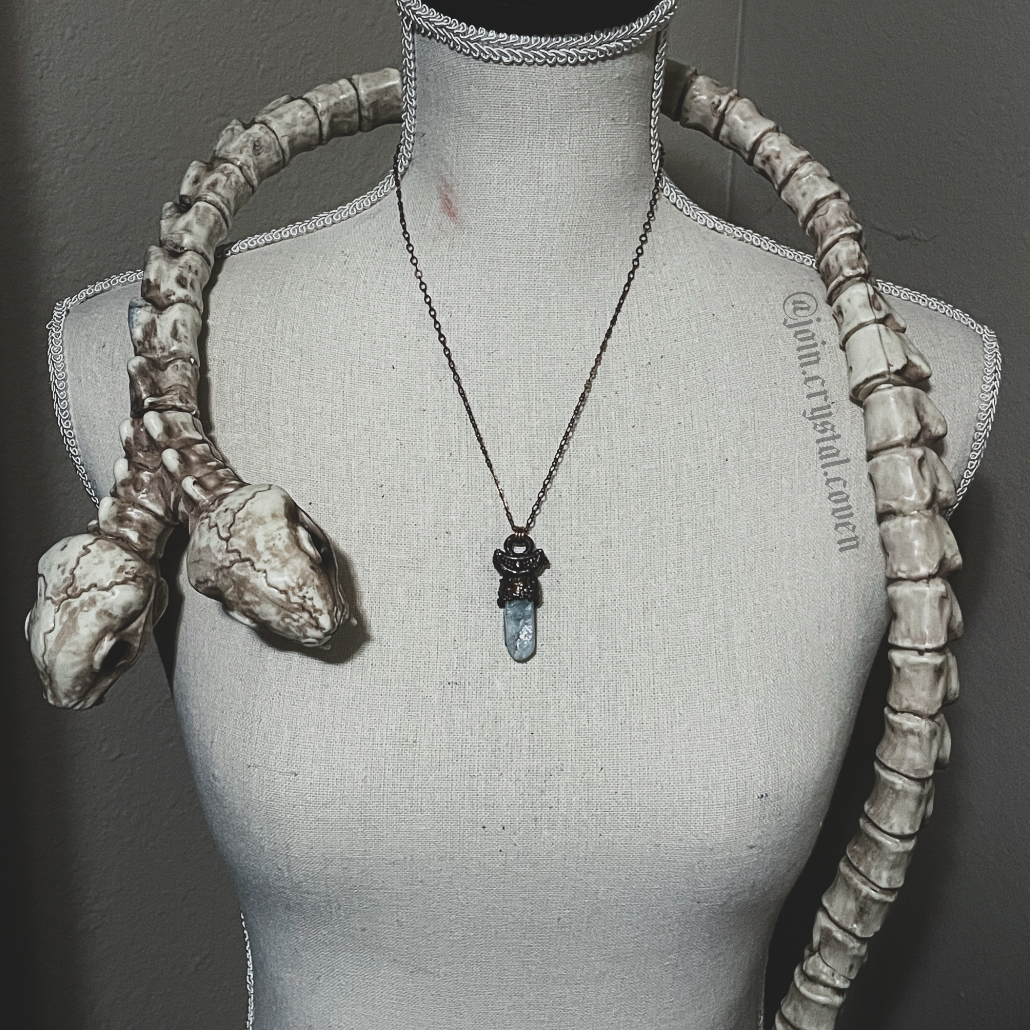 The Aquamarine Moon Talisman features Aquamarine carefully encased in a thick amount of blackened copper.