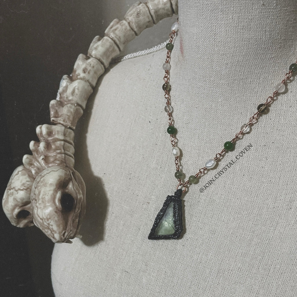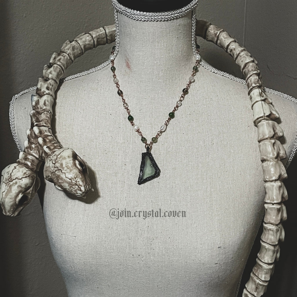 The Sea Glass Talisman features beach glass (that I gathered locally) carefully encased in a thick amount of blackened copper. The chain is handmade using raw copper, Green Apatite, fresh water pearls, Canadian Jade, Smoky Quartz and faceted Clear Quartz.