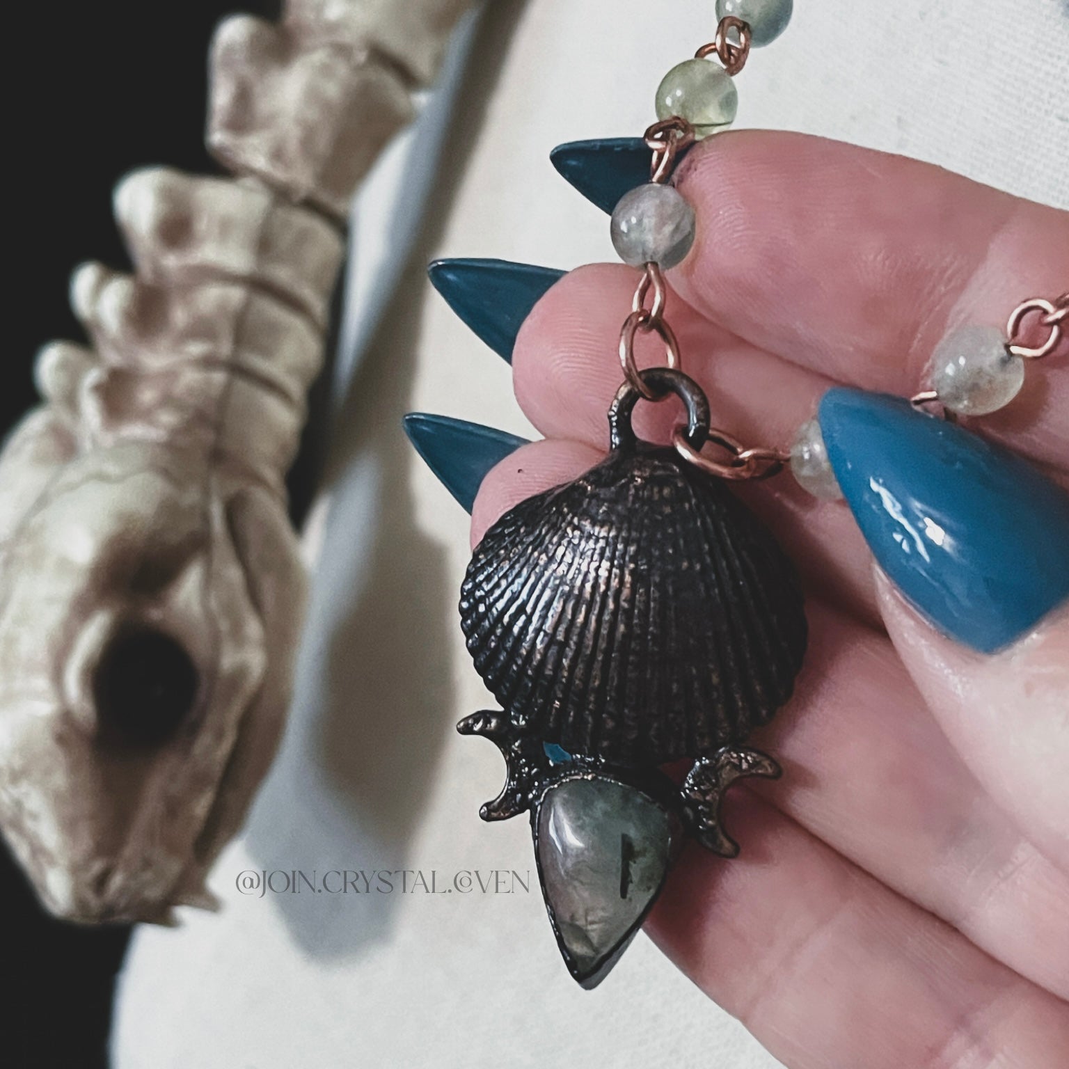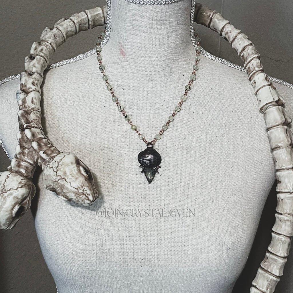 The Prehnite Water Witch Talisman features Prehnite and a seashell (that I gathered locally) carefully encased in a thick amount of blackened copper. The chain is handmade using raw copper and Prehnite beads.