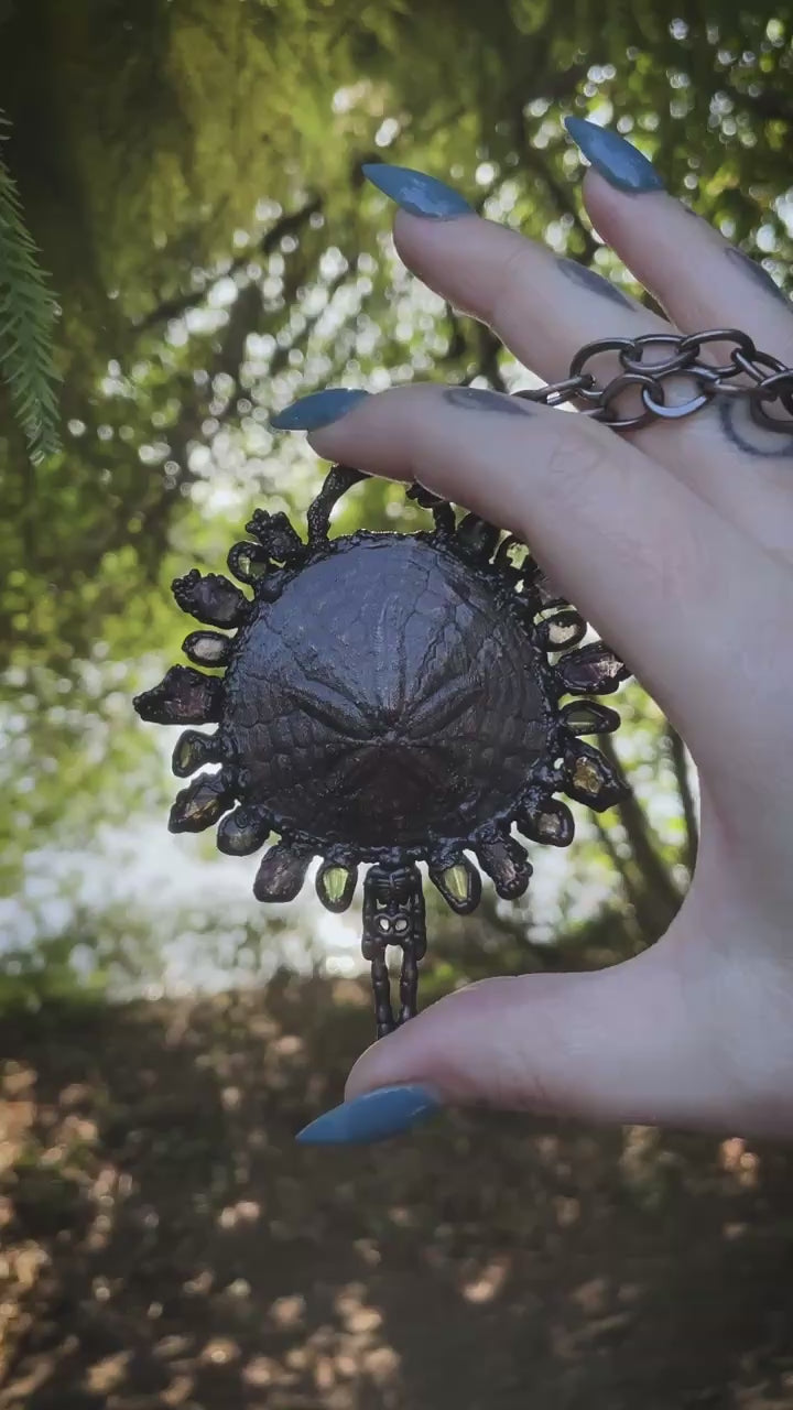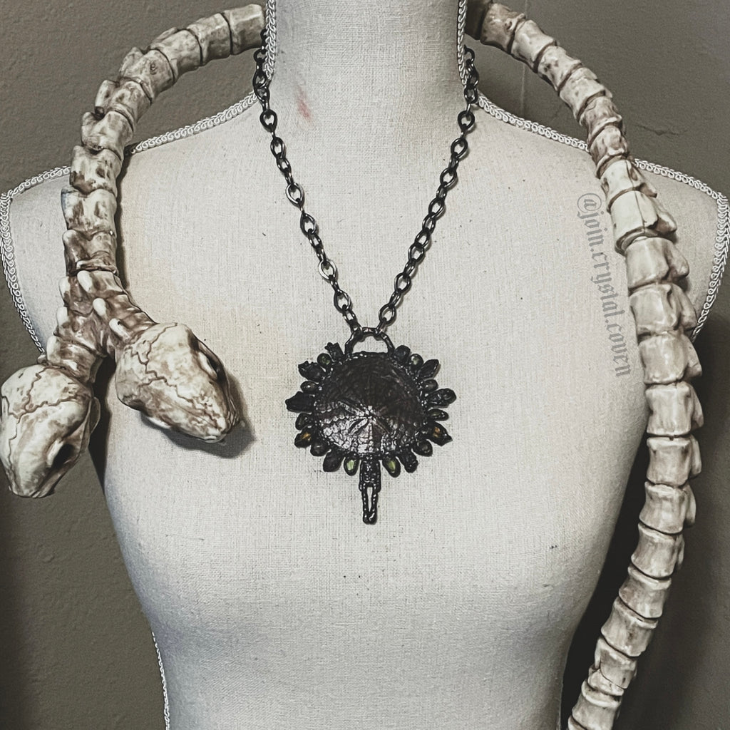 The Sea Spirit Talisman features a sand dollar I gathered, Amethyst, Citrine, Peridot, Rose Quartz and a skeleton carefully encased in a thick amount of blackened copper. The chain is black leather.
