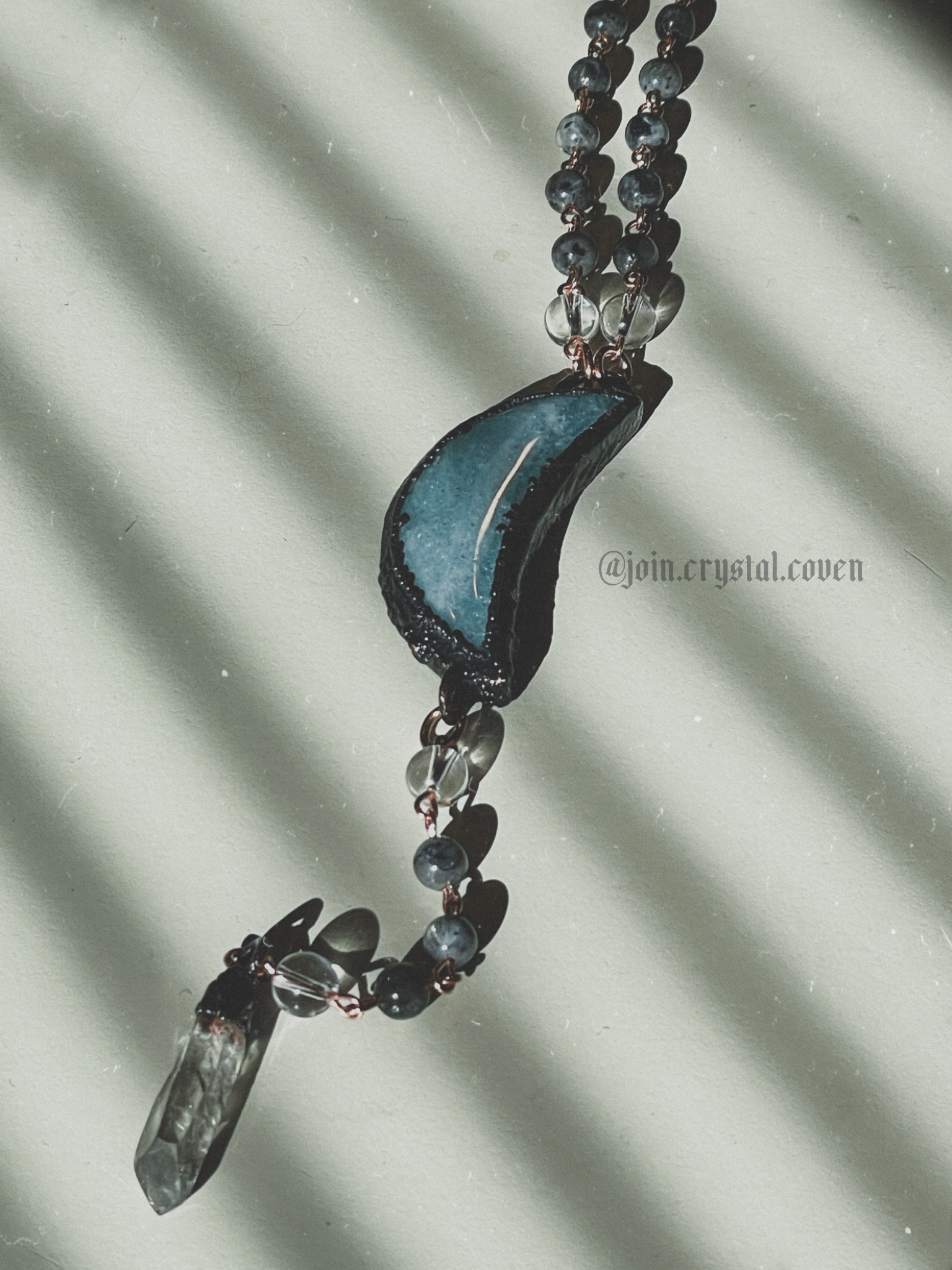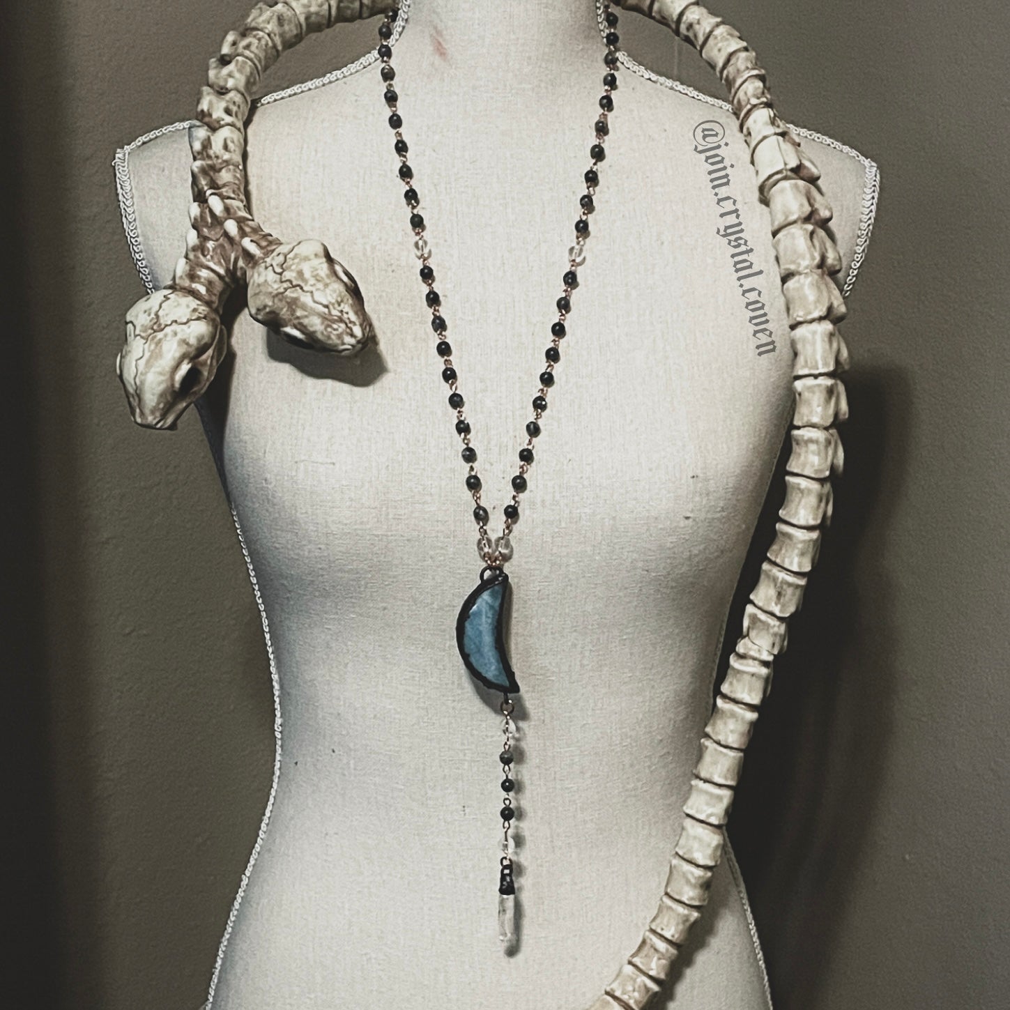 The Water Witch’s Rosary Talisman features an Aquamarine moon center and Clear Quartz point. The beads are Clear Quartz and Larvikite.