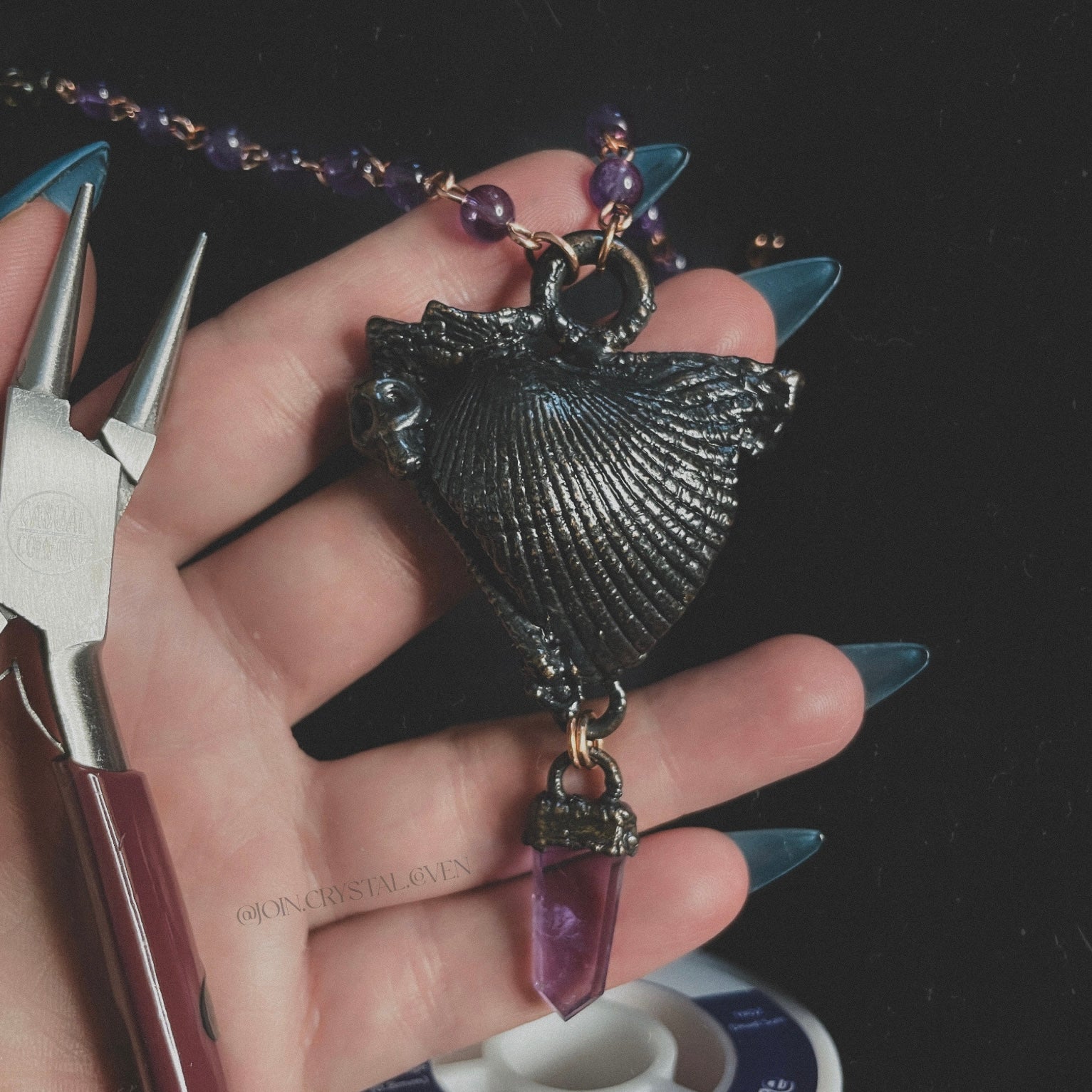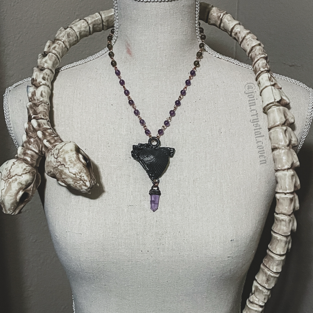 The Water Witch’s Warding Talisman features a polished Amethyst crystal point, shell I collected and skeleton carefully encased in a thick amount of blackened copper. The chain is handmade using raw copper, Amethyst and Smoky Quartz beads.