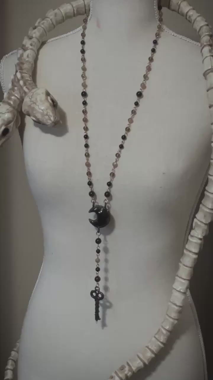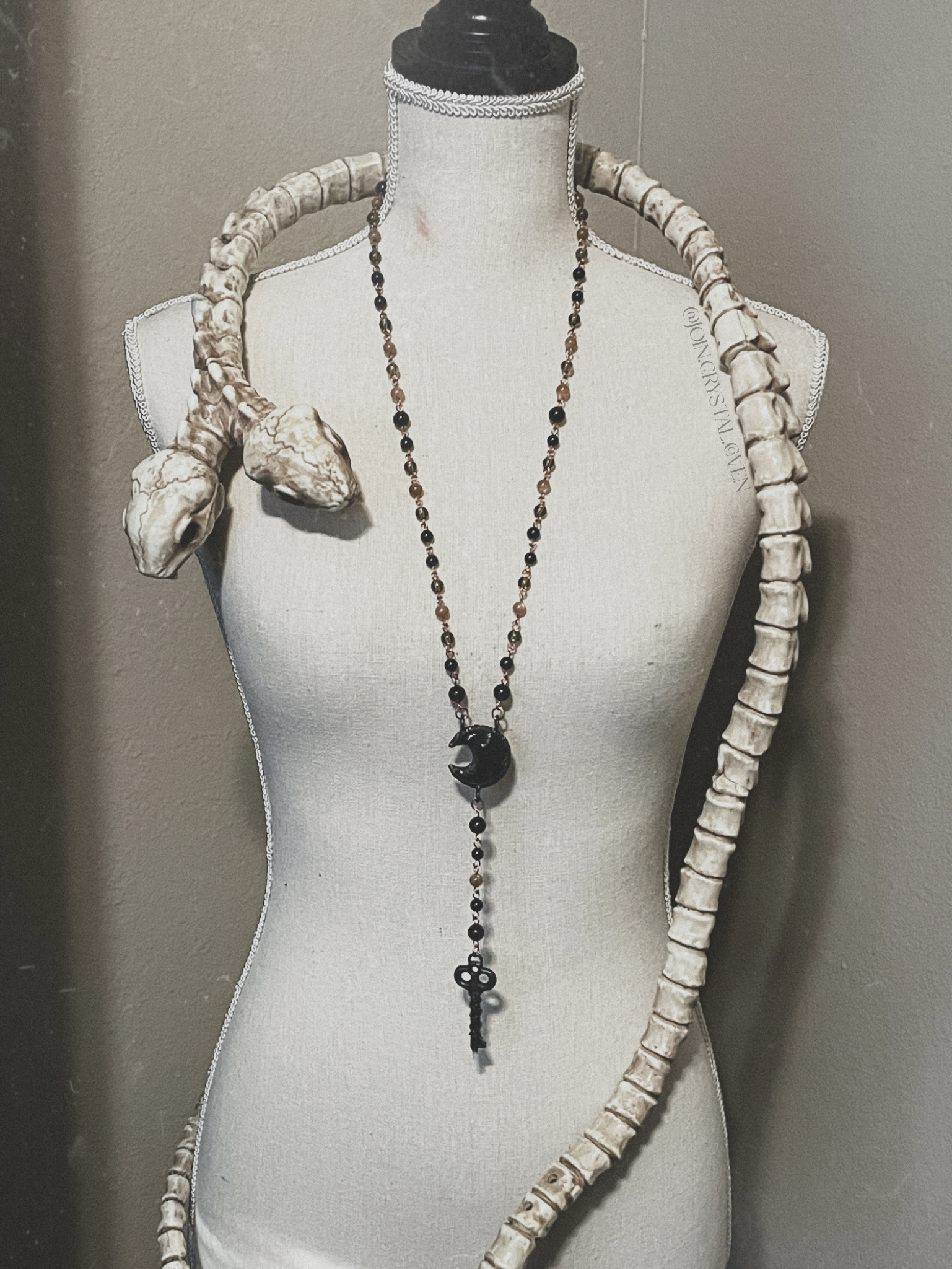This Witch’s Rosary features an Obsidian moon center and a key fitted it’s a tiny Clear Quartz point. The beads are Smoky Quartz, Peach Moonstone, and Black Tourmaline.